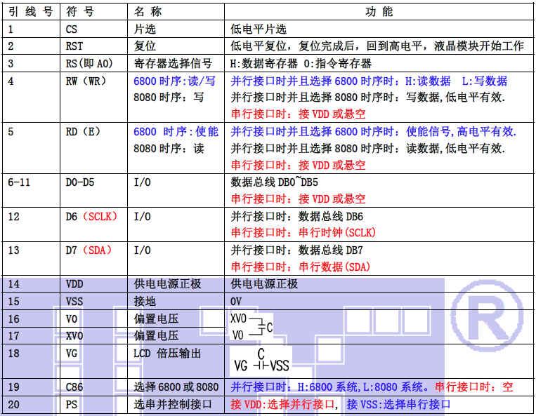 6. 接口简单方便: 采用 4 线 SPI 串行接口,或选择并口(6800 时序和 8080 时序可选)。