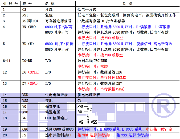 6. 接口简单方便: 采用 4 线 SPI 串行接口,或选择并口(6800 时序和 8080 时序可选)。