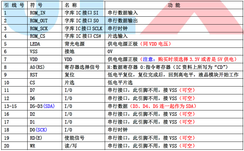 (2)四线串行时接口引脚功能: