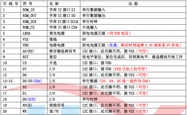 (3)I²C 总线时接口引脚功能: