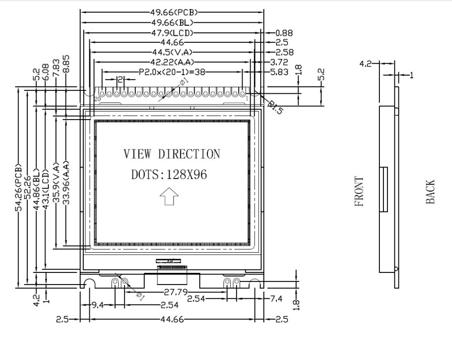 ●或显示16 个×8 行=128 个的8*16 点阵的英文、数字、符号。