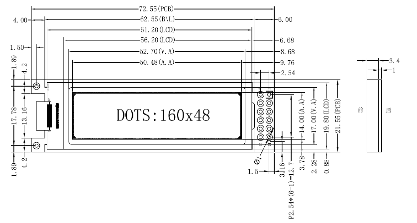3. 功耗低:当电压为3.3V 时,功耗低:不带背光1mW(3.3V*0.3mA),带背光不大于100mW