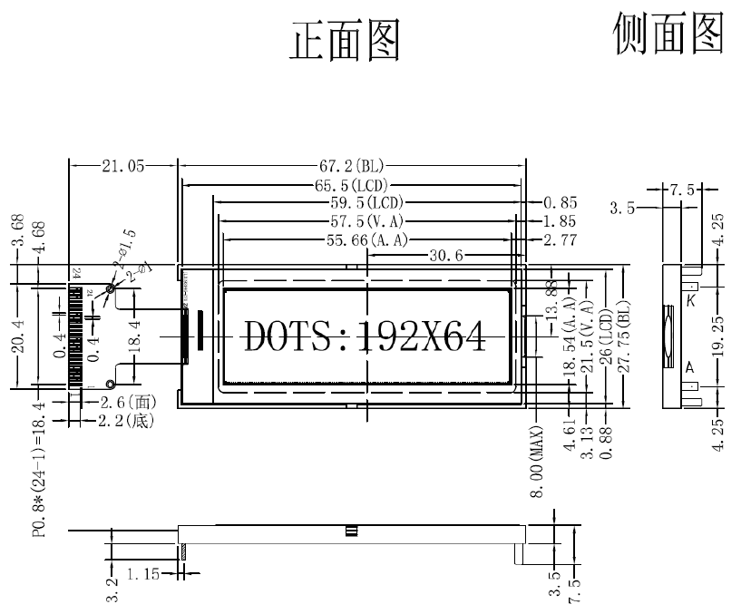 3. 功耗低:当电压为3.3V 时,功耗低:不带背光1.3mW(3.3V*0.39mA),带背光不大于101mW