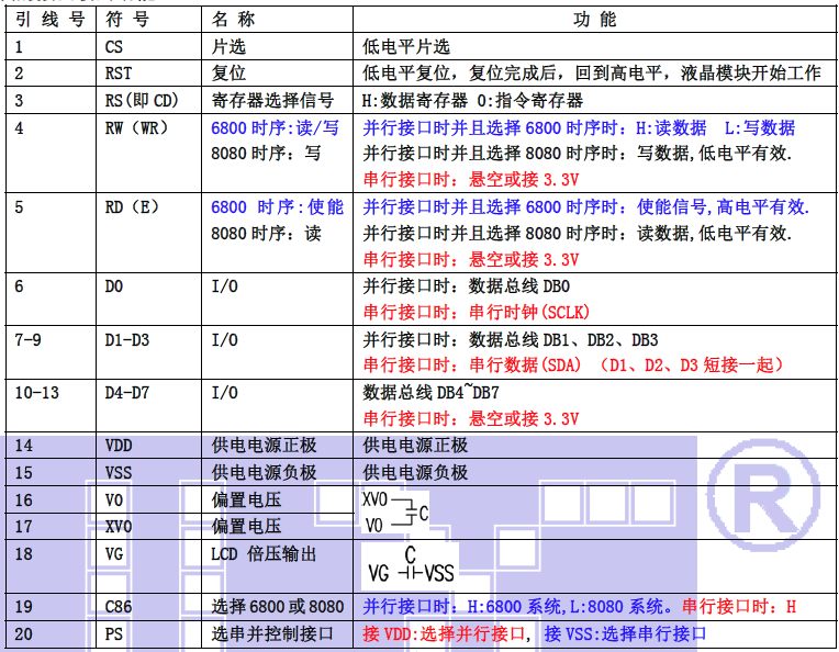 6. 接口简单方便:采用 4 线 SPI 串行接口,或选择并口(6800 时序和 8080 时序可选)。