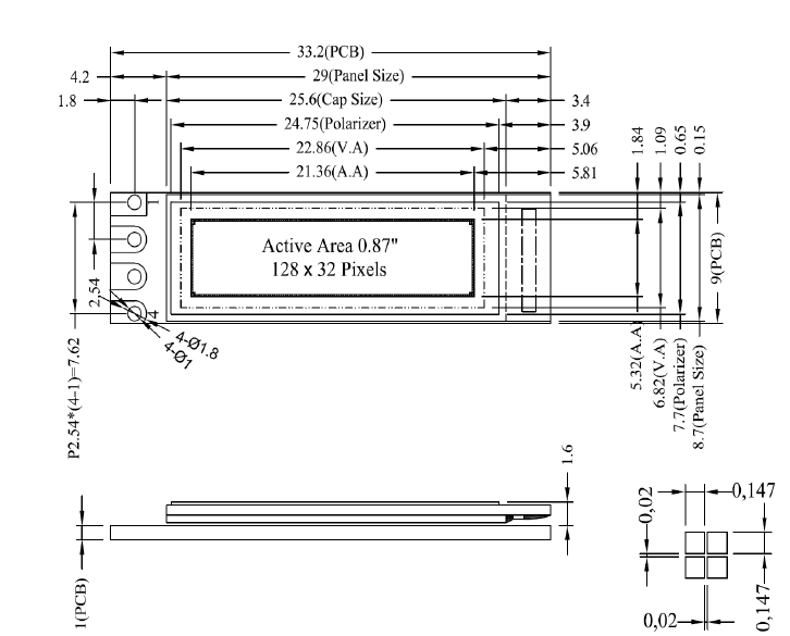 1. 结构牢:焊接式FPC。 2. IC 采用SSD1316Z,功能强大,稳定性好 3. 功耗低。 4. 显示内容: ●128*32 点阵单色图片; ●可选用16*16 点阵或其他点阵的图片来自编汉字,按照16*16 点阵汉字来计算可显示8 字/行*2 行。 5. 指令功能强:可组合成各种输入、显示、移位方式以满足不同的要求; 6. 接口简单方便:IIC 接口。 7. 工作温度宽:-40℃ - 85℃; 8. 储存温度宽:-40℃ - 85℃;