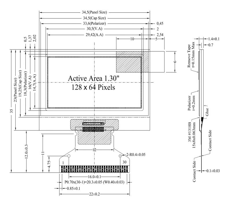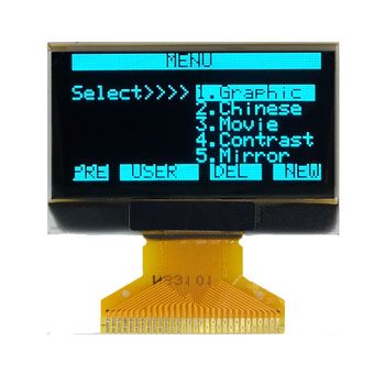 1. 结构牢:焊接式FPC。 2. IC 采用SH1106,功能强大,稳定性好 3. 功耗低。 4. 显示内容: ●128*64 点阵单色图片; ●可选用16*16 点阵或其他点阵的图片来自编汉字,按照16*16 点阵汉字来计算可显示8字/行*4 行。 5. 指令功能强:可组合成各种输入、显示、移位方式以满足不同的要求; 6. 接口方式: 4 线SPI 串行接口、并口、I2C 接口。 7. 工作温度宽:-40℃ - 85℃; 8. 储存温度宽:-40℃ - 85℃;