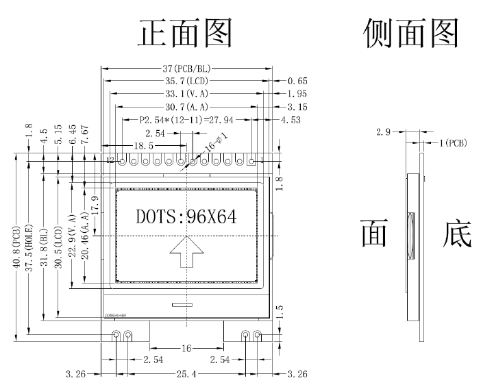 3. 功耗低: 不带背光1mW(3.3V*0.3mA),带背光不大于140mW(3.3V*30mA);