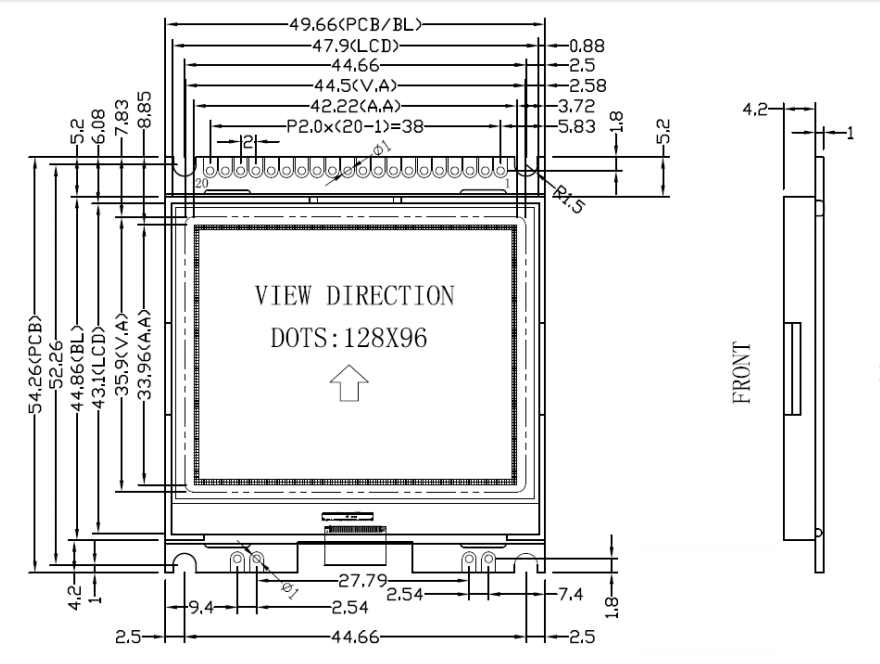 ●或显示16 个×8 行=128 个的8*16 点阵的英文、数字、符号。