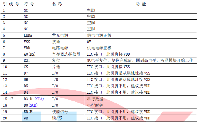 6. 接口简单方便: 采用4 线SPI 串行接口,或选择并口(6800 时序和8080 时序可选),或I2C