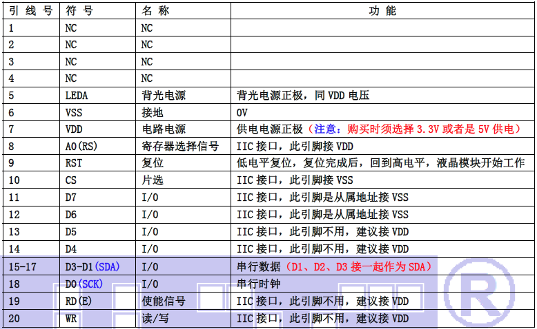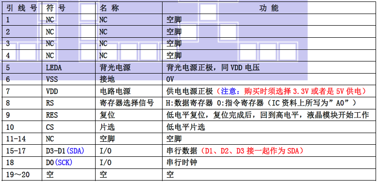 6. 接口简单方便: 采用4 线SPI 串行接口,或选择并口(6800 时序和8080 时序可选),或I2C