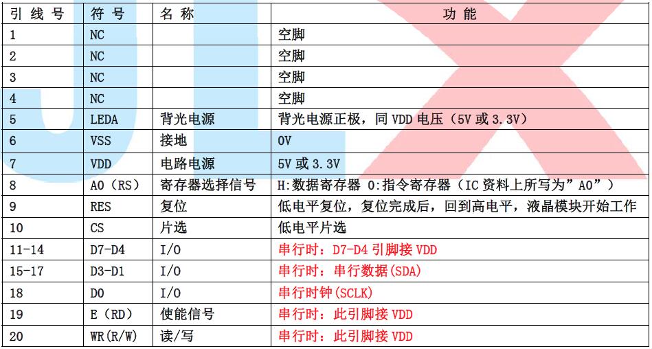 6.接口简单方便: 采用 4 线 SPI 串行接口,或选择并口(6800 时序和 8080 时序可选),或 I2C(I2C)接口。