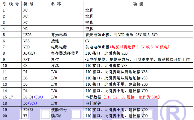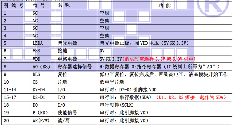 (2)四线串行时接口引脚功能