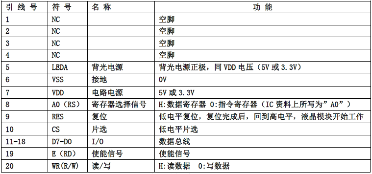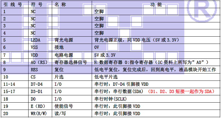 (2)四线串行时接口引脚功能: