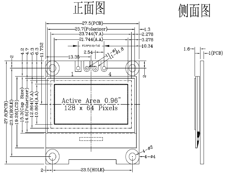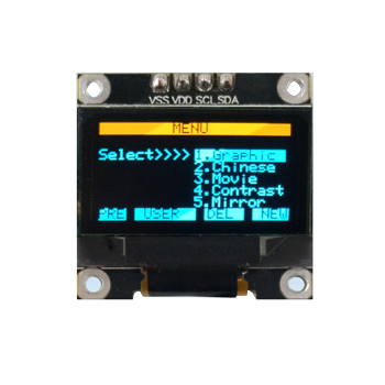 1. 结构牢:焊接式FPC。 2. IC 采用SSD1306,功能强大,稳定性好 3. 功耗低。 4. 显示内容: ●128*64 点阵单色图片; ●可选用16*16 点阵或其他点阵的图片来自编汉字,按照16*16 点阵汉字来计算可显示8字/行*4 行。 5. 指令功能强:可组合成各种输入、显示、移位方式以满足不同的要求; 6. 接口简单方便:采用I2C 接口。 7. 工作温度宽:-40℃ - 70℃; 8. 储存温度宽:-40℃ - 85℃;