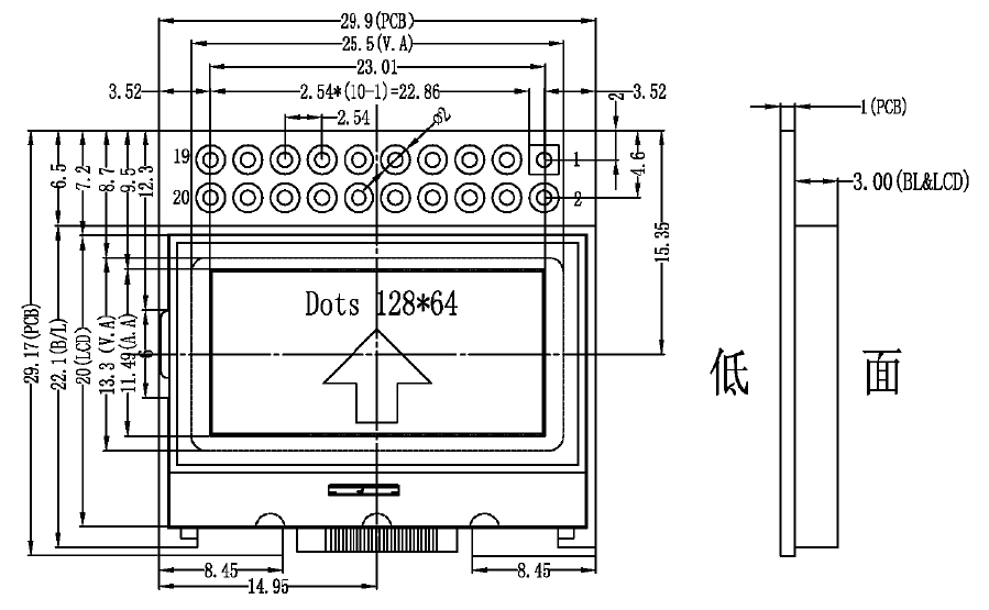 3. 功耗低:1~100mW(关掉背光:0.3mA@3.3V,打开背光不大于100mW);