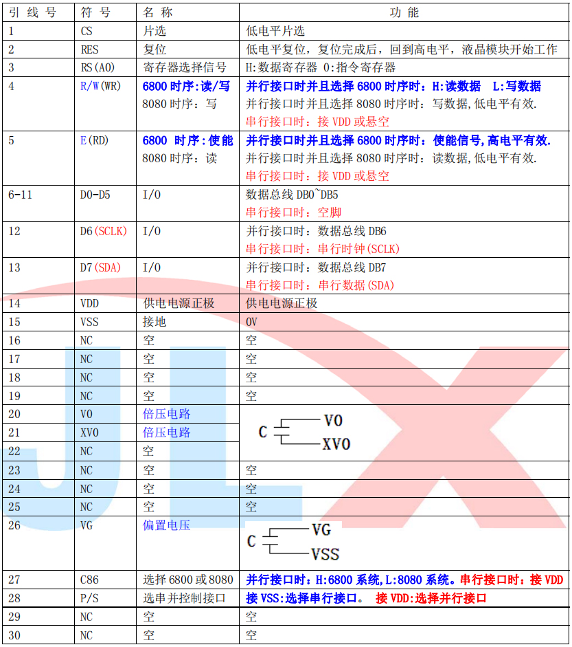 6. 接口简单方便:可采用 4 线 SPI 串口,或选择并口(6800 时序和 8080 时序可选)。