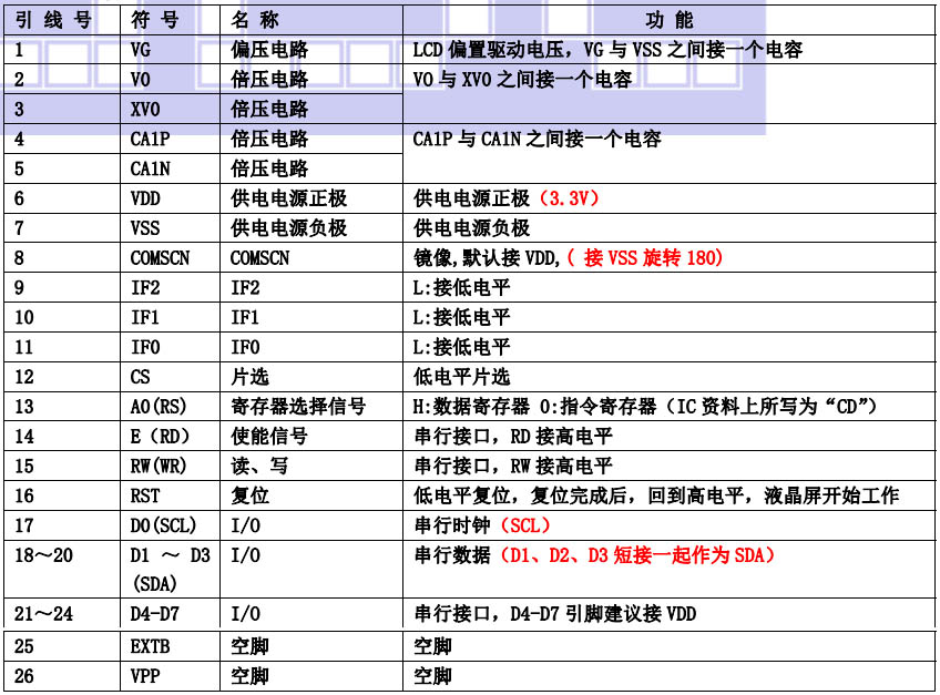 (2)四线串行时接口引脚功能:
