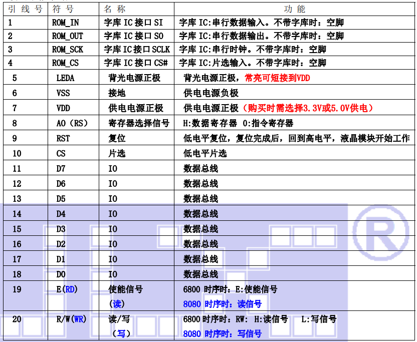 (1)并行时接口引脚功能: