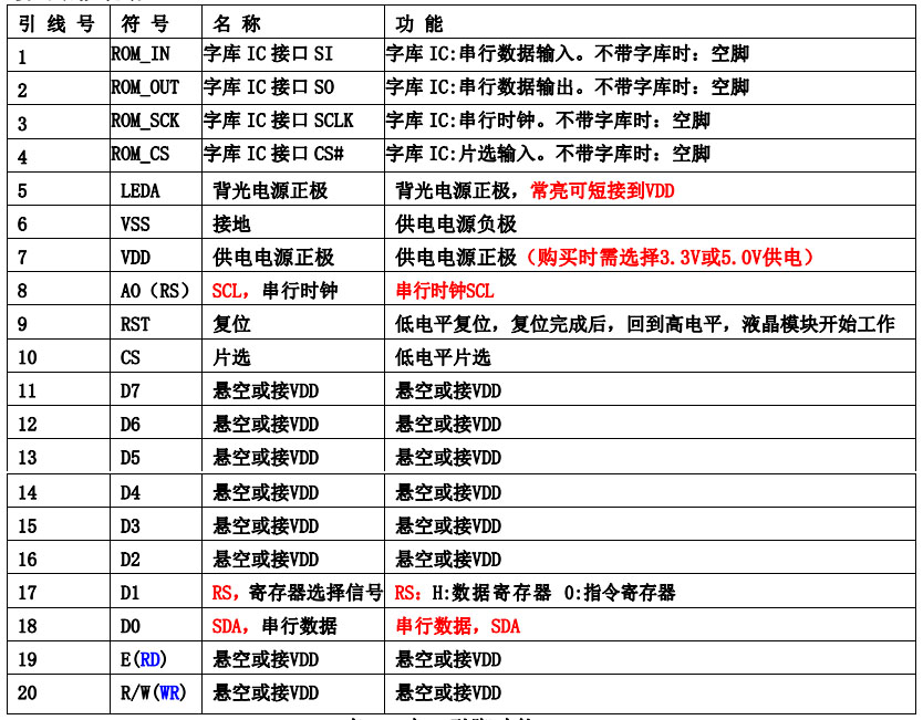 (2)四线串行时接口引脚功能: