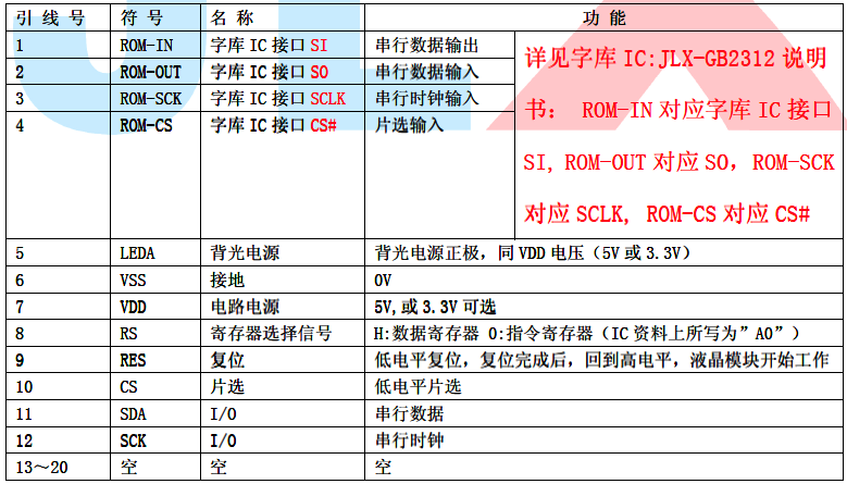 6. 接口简单方便: 采用4 线SPI 串行接口,或选择并口(6800 时序和8080 时序可选)。
