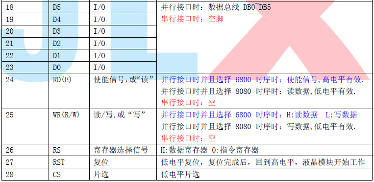 6. 接口简单方便:可采用 4 线 SPI 串口,或选择并口(6800 时序和 8080 时序可选)。