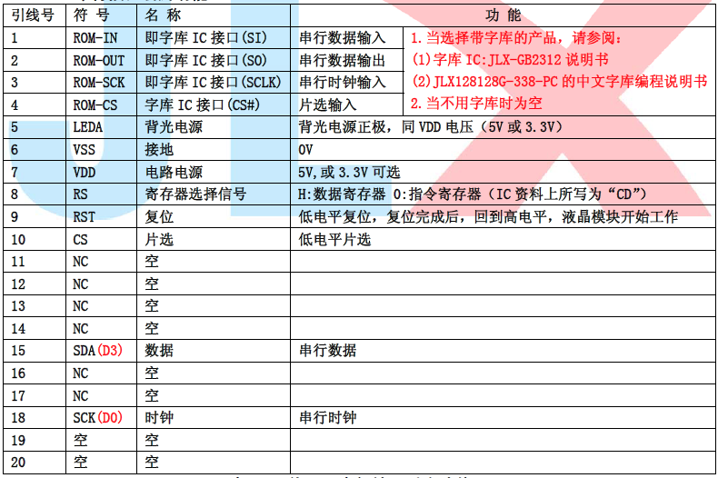 (2)四线串行时接口引脚功能: