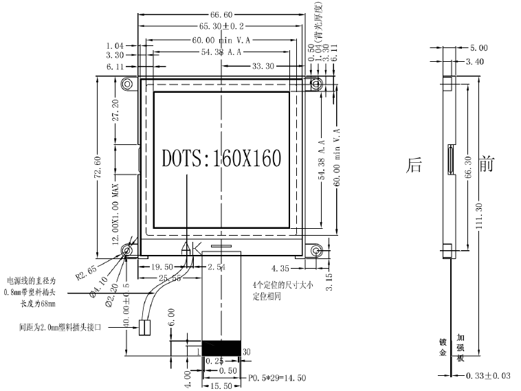 3. 功耗低:1 - 100mW(不开背光1mW <3.3V@0.3mA>,开背光不大于100mW<3.3V@30mA>);