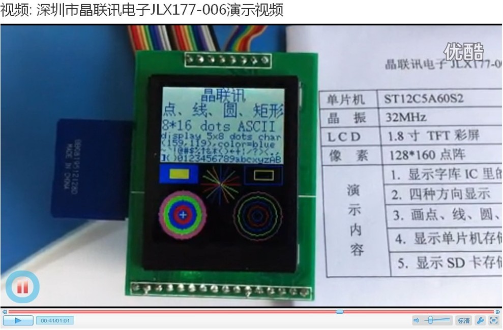 晶联讯电子成功开发出带中文字库的TFT彩屏,1.8英寸、2.4英寸、3.2英寸等TFT彩屏原本主要应用于手机,手机应用的特点是采用的微处理器是ARM内核,在手机应用中还有FLASH 存储器的配合,这一切给彩屏显示彩图及彩色文字带来了便利,但价格昂贵的ARM芯片及FLASH存储芯片让许多使用51系列\AVR系列\MSP430系列\PIC系列等低价单片机开发项目望而却步。难道就无法将TFT彩屏应用于这些开发项目上了吗?晶联讯帮广大用户想到了一个好办法-将字库IC集成在液晶屏的PCB上!并将范例程序准备好了,广大用户就可以方便应用了,达到以下照片的效果是轻而易举了!