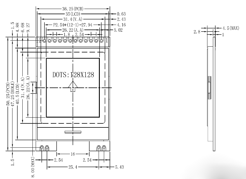 ●或显示16 个×8 行=128 个的8*16 点阵的英文、数字、符号。