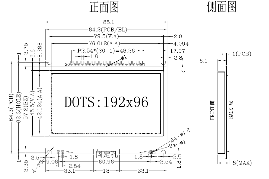 3. 功耗低:1 - 100mW(不带背光1mW <3.3V@0.3mA>,带背光不大于100mW<3.3V@30mA>);