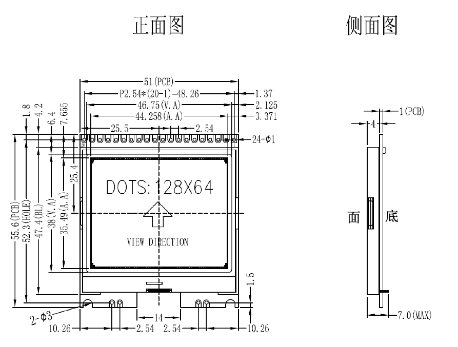 5. 指令功能强: 可软件调对比度、正显/反显转换、行列扫描方向可改(可旋转180 度使用)。