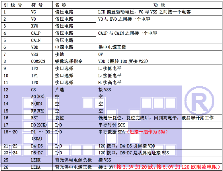 6. 接口简单方便: 采用4 线SPI 串行接口,或选择并口(6800 时序和8080 时序可选),或I2C