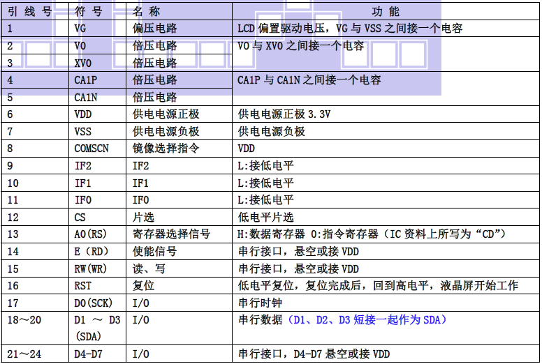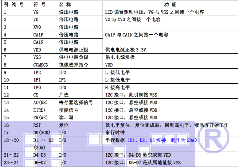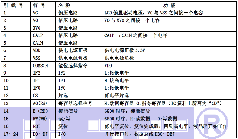 6. 接口简单方便: 采用4 线SPI 串行接口,或选择并口(6800 时序和8080 时序可选),或I2C